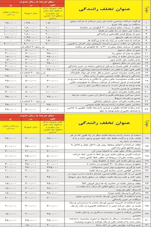تعرفه های جریمه های رانندگی در سال ۹۷